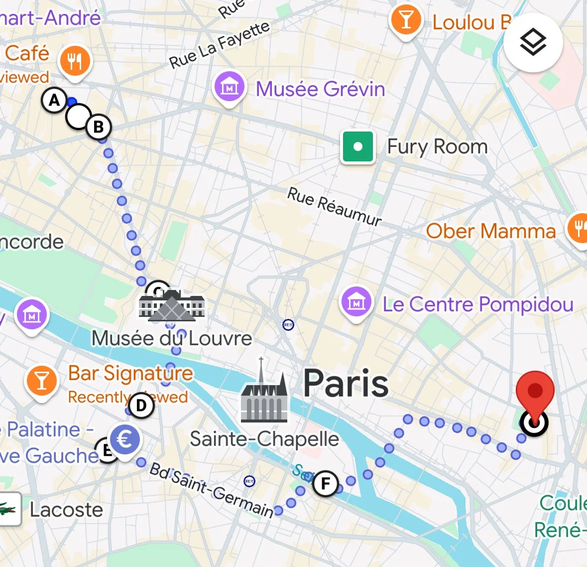 My walking route from the Parfum Museum down through some of Paris's most storied neighborhoods - from the luxury of Opera district to the historic Marais.